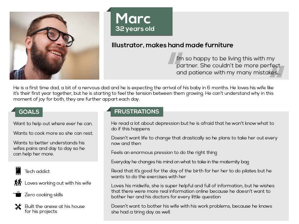 So this is how we get to Marc, my user persona. A 32 yo first time dad, an illustrator that makes handmade furniture in his spare time, and that embodies the most important and most recurrent wins and pain points of all the people that I talked to.